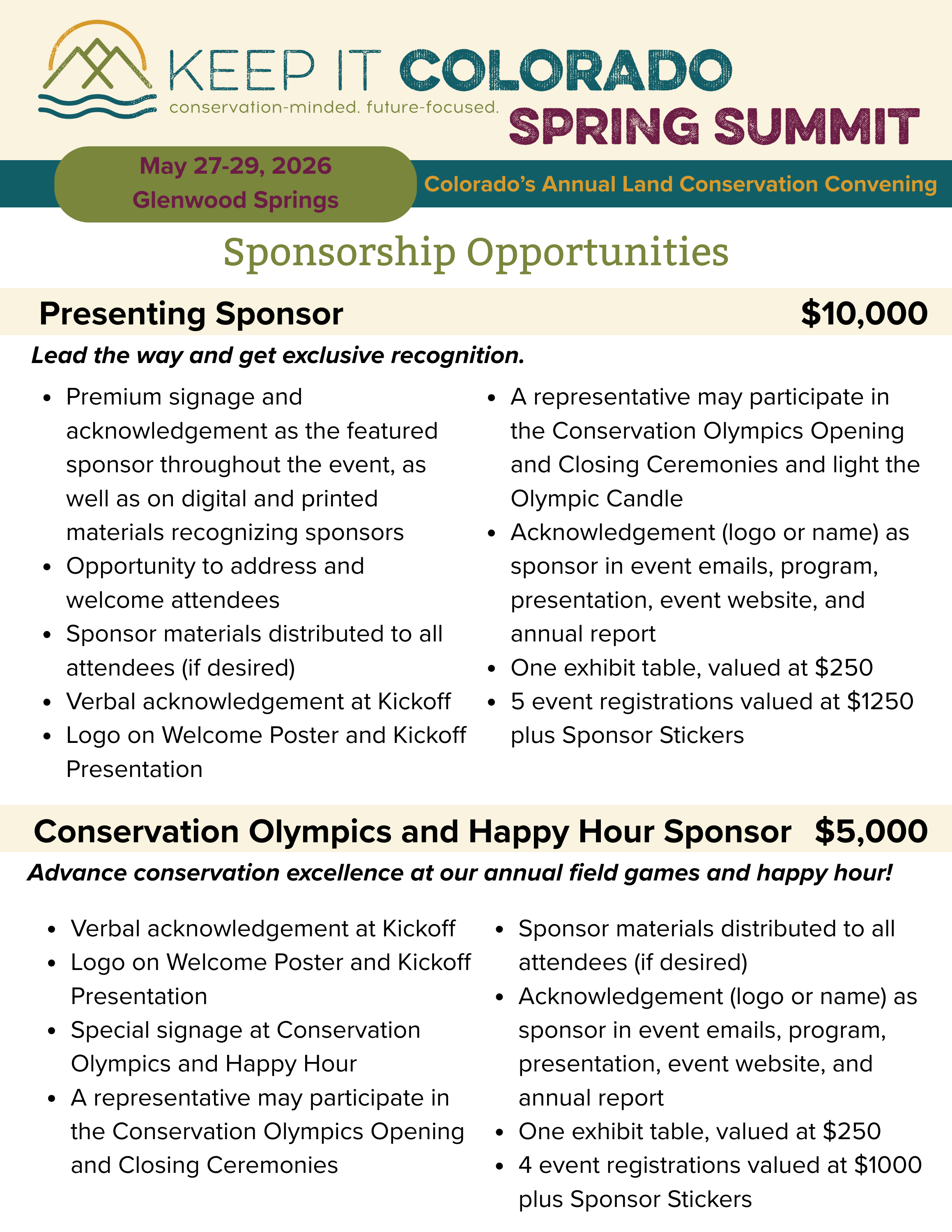 Thank you for considering sponsoring Keep It Colorado’s annual land conservation convening this year. We have created a variety of opportunities that offer benefits for you at every level - while supporting our work.